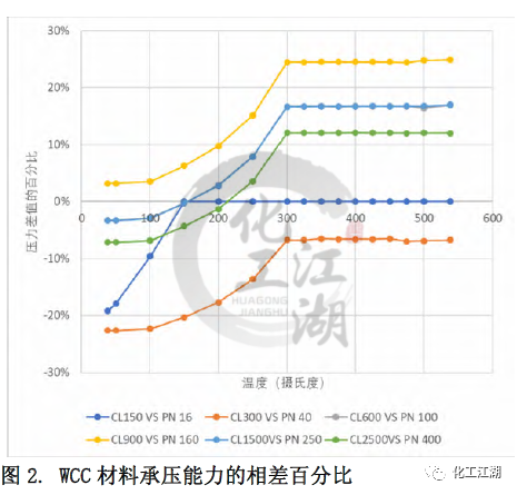 本文采用了對比冷(常溫)工作壓的方法來近似推算出與ASME標準Class壓力等級最鄰近的EN標準PN壓力等級。EN12516-1標準中列出的所有材料的冷工作壓都是相同的。而ASME B16.34標準中列出的冷工作壓和材料相關,故選取了其中一種較強材料(C12A)的冷工作壓用于對比。 通過對比得到每個ASME標準 Class壓力等級對應的最鄰近的EN標準 PN壓力等級,見表1。同時,這樣的對應關系也和閥門設計的通用做法一致。本文的管道內徑,最小壁厚,材料承壓能力的對比都是依照表1中的對應關系來進行的。 1.2 材質承壓能力的對比 無論是ASME標準還是EN標準都列出了一些ASTM標準材料的壓力溫度等級,即材料在不同溫度下的承壓能力。本文選取了常見的閥體材料:碳鋼WCC,合金鋼 WC9和C12A進行研究,來對比兩個標準中相同材料在標準壓力等級下的承壓能力的差別。 圖1和圖 2顯示了WCC材料的溫度壓力曲線和Class與PN的對比,可以看出: (1)對于ASME的 Class 150和EN12516-1 的PN16,當溫度低于150攝氏度時,EN標準規定的材料承壓能力低于ASME標準規定的材料承壓能力,且隨著溫度升高,差距逐漸縮小。當溫度高于150攝氏度時,兩個標準對相同材料的承壓能力的規定近乎相同。 (2)對于ASME的 Class 300和EN12516-1 的PN40,在整個溫度的范圍內,EN標準規定的材料承壓能力均低于ASME標準規定的材料承壓能力。當溫度低于300攝氏度時,隨著溫度升高,差距逐漸縮小。當溫度高于300攝氏度時,兩個標準對相同材料的承壓能力的規定差別趨于一致,約為-7%。 (3)對于ASME的 Class 900和EN12516-1 的PN160, 在整個溫度的范圍內,EN標準規定的材料承壓能力均高于ASME標準規定的材料承壓能力。當溫度低于300攝氏度時,隨著溫度升高,差距越來越大。當溫度高于300攝氏度時,兩個標準對相同材料的承壓能力的規定差別趨于一致,約為24%。 (4)還有一點值得注意的,除了PN16,其他PN壓力等級對應的工作壓力在低于300攝氏度以下都是一樣的,而ASME等級對應的工作壓力是隨著溫度升高持續下降的。 1.3 對閥體設計的指導 在實際設計過程中,無論是為了縮短新產品推向市場的時間,還是從產品標準化、成本優化的角度去考慮,盡可能多地將已有的設計或者零部件(尤其是需要開發鑄造模具的閥體)應用到新的產品中,都是設計師不可避免要考慮的問題,可以采用同一個閥體鑄件的設計來滿足ASME 標準和EN標準的要求呢?為了解答這個問題,本文選取了三個不同壓力等級-低、中、高的十二個具體實例,各項參數的對比結果如表3 所示。 (1)低壓ASME Class 300與 EN PN40 從表3中差別的百分數可以看出,在兩個尺寸下,滿足ASME標準和EN 標準的管道內徑和最小壁厚的差別,均小于5%。就是說,用同一個閥體設計來滿足兩個標準的設計要求是可以接受的。同時從圖2中可以看出,閥體常見材料在這兩個等級的承壓能力差別也較小,10%以內。因此,兩個設計可以在類似的實際工況中應用。 (2)中壓ASME Class 900與 EN PN160 對于中壓下尺寸為DN100和DN200的兩組設計,從差別的百分數可以看出,雖然每組中要對比的兩個設計的管道內徑非常接近,但是所要求的最小壁厚卻相差較多,超過了20%。在這種情況下,實踐中也是可以用同一個閥體設計來滿足兩個標準的設計要求的,但是需要評估由此帶來的對最小壁厚要求較小的閥體的成本的影響。另一方面,從圖2中可以看出,閥體常見材料在這兩個等級的承壓能力差別較大,在有些溫度下差別達到20%。這種材料承壓能力上的差別和最小壁厚的差別是一致的。 (3)高壓ASME Class 2500與EN PN400 對于高壓下尺寸為DN100和DN200,閥門的管道內徑和最小壁厚存在著巨大差別,30%-50%,故采用同一個閥體設計來滿足兩個標準的設計要求是不合理的。 還有另外一個因素需要在閥體設計時考慮,那就是閥體兩個端口之間的長度。ASME B16.34中指出可以按照ASME B16.10來確定端口對端口尺寸。EN12516-1 并未提及端口對端口尺寸,但歐標體系中EN558規定了端口對端口的尺寸。考慮到端口對端口尺寸并非標準強制要求,故本文未提供ASME B16.10和EN558的區別。 (1)管道內徑 ASME標準和EN標準在管道內徑的主要差別在于管道內徑是否隨著壓力等級的變化而變化。閥體設計時,管道內徑的差異會進一步放大閥門最小壁厚的差異。 (2)最小壁厚 兩個標準在閥門最小壁厚上的差異與壓力等級有關,差別大致在6%到 26%之間。 (3)材料承壓能力 本文所研究的五種材料在兩個標準相鄰壓力等級間的對比趨勢類似。當溫度高于一定值時,兩個標準對相同材料的承壓能力的規定的差別趨于一致,但不同的壓力等級的差別大小不一。 (4)通過十二個實例驗算,發現對于DN100和DN200, 同類設計壓力下,ASME標準和EN標準對管道內徑和最小壁厚要求的差別非常接近。并解釋了在實際設計工作中,需要根據具體的閥門尺寸,壓力等級一一比較管道內徑和最小壁厚等設計參數,并考慮到時間和成本的平衡,才能做出合理的決定。