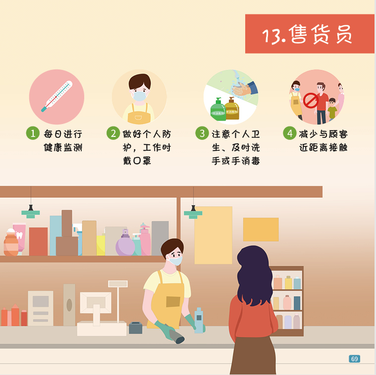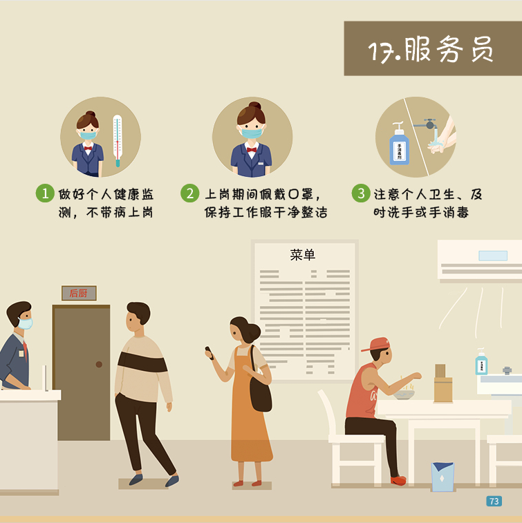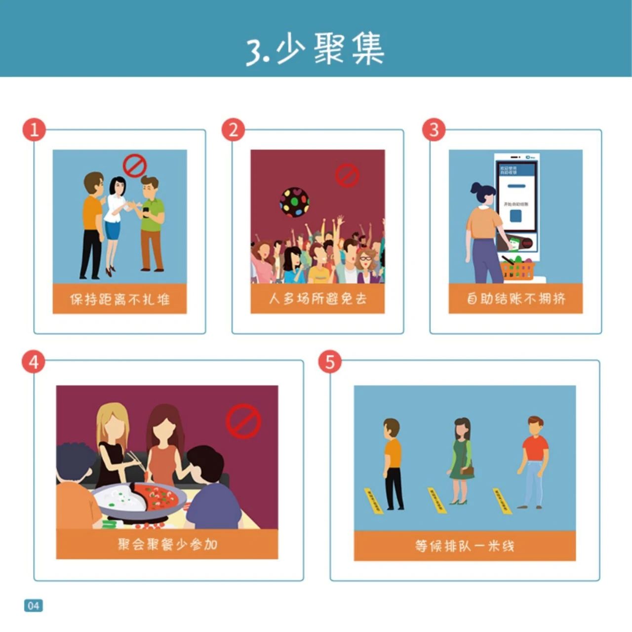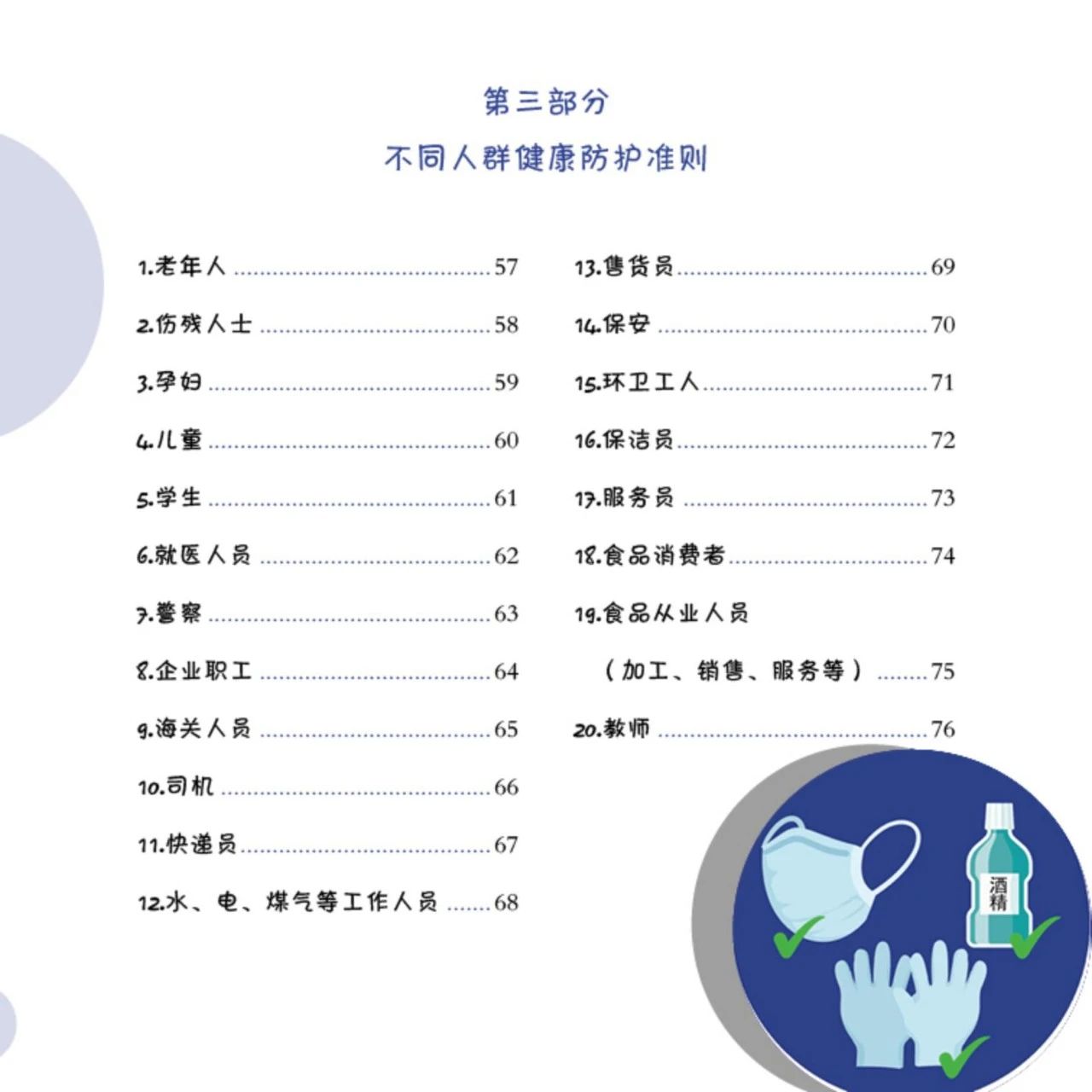 《公民防疫行為準(zhǔn)則》(科普版)共三部分73類。 第一部分為公民防疫基本行為準(zhǔn)則,包括勤洗手、戴口罩、少聚集、分餐制、社交禮儀以及廁所衛(wèi)生、通風(fēng)與消毒、健康生活等八方面; 第二部分和第三部分針對重點場所、重點人群主動防疫的關(guān)鍵風(fēng)險點,對不同場景、不同人群提出健康防護(hù)準(zhǔn)則。 旨在通過圖文并茂、貼近生活的形式,讓公眾看得懂、易接受、記得牢、做得到,將公民防疫行為準(zhǔn)則作為一種社會文明風(fēng)尚和健康生活方式,持久地堅持下去、推廣開來。