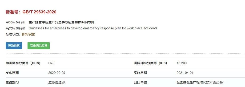 重磅!GBT29639-2020《生產經營單位生產安全事故應急預案編制導則》發布,21年4月實施!