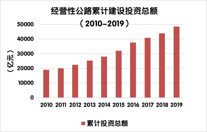 與上年末相比,經營性公路累計建設投資總額由43953億元增加到48546.1 億元,凈增4593.2 億元,增長10.5%。其中,經營性高速公路累計建設投資總額由41443.3億元增加到45864.7 億元,凈增4421.5 億元,增長10.7%。