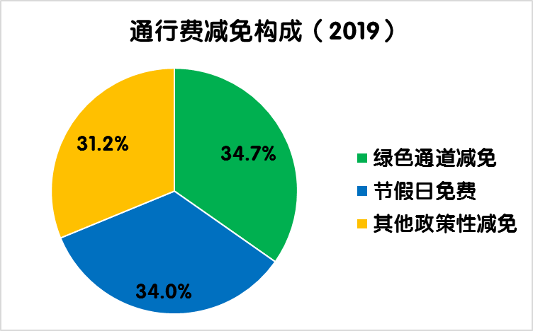 2019年度,全國收費公路共減免車輛通行費1009.7億元,占2019年度應收通行費總額的14.5%,比上年增加91.9億元,增長10%。其中,鮮活農產品運輸“綠色通道”減免350.8億元,占全年通行費減免總金額的比例為34.7%,比上年增加5.8億元,增長1.7%;重大節假日免收小型客車通行費343.7億元,占全年通行費減免總金額的比例為34.0%,比上年增加35.7億元,增長11.6%;高速公路差異化收費、ETC通行費優惠、搶險救災車輛免費等其他政策性減免315.3億元,占全年通行費減免總金額的比例為31.2%。比上年增加50.4億元,增長19%。