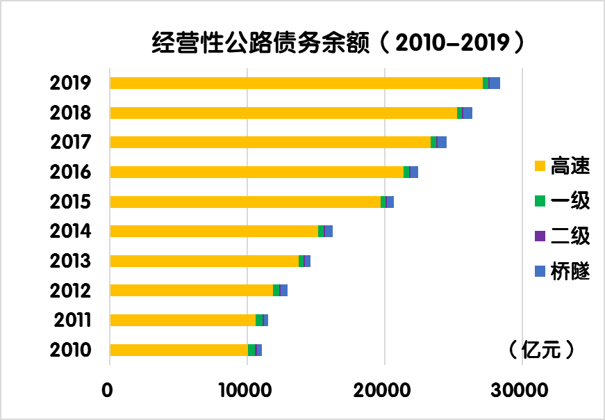 與上年末相比,政府還貸公路債務余額由30536.1 億元增加到33147.7億元,凈增 2611.6億元,增長8.6%。其中,政府還貸高速公路債務余額由28420.3 億元增加到30889.7 億元,凈增2469.4 億元,增長8.7%。