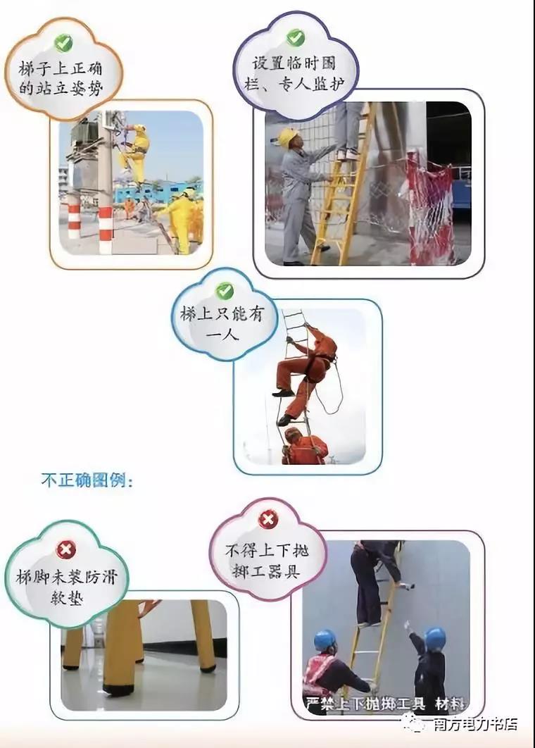(6)在部分停電或不停電的作業(yè)環(huán)境下,應(yīng)使用絕緣梯。在帶電設(shè)備區(qū)域中,距離運(yùn)行設(shè)備較近時(shí),嚴(yán)禁使用金屬梯。在戶外變電站和高壓室內(nèi)搬動(dòng)梯子、管子等長(zhǎng)物,應(yīng)兩人放倒搬運(yùn),并與帶電部分保持足夠的安全距離,以免人身觸電氣設(shè)備發(fā)生事故。