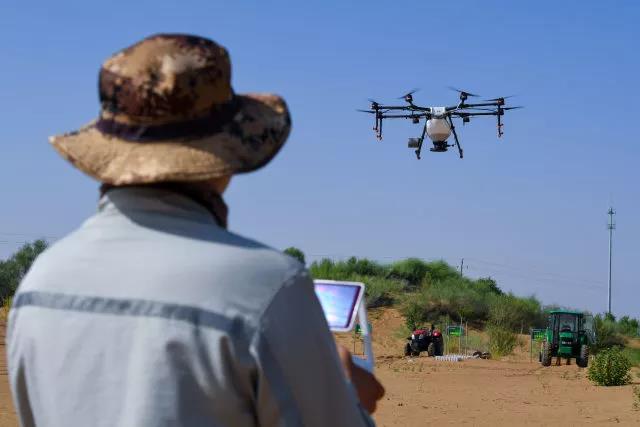 ↑這是內(nèi)蒙古鄂爾多斯市杭錦旗庫布其沙漠中的生態(tài)修復(fù)景觀(2018年7月11日無人機拍攝)