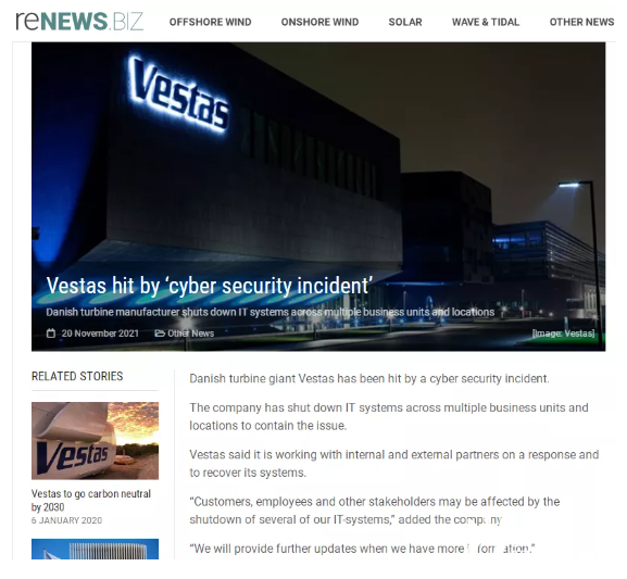 據(jù)外媒報(bào)道,11月20日維斯塔斯遭遇網(wǎng)絡(luò)安全事故,目前已經(jīng)關(guān)閉多個(gè)業(yè)務(wù)部門(mén)和地點(diǎn)的信息技術(shù)系統(tǒng),以控制這一問(wèn)題。
