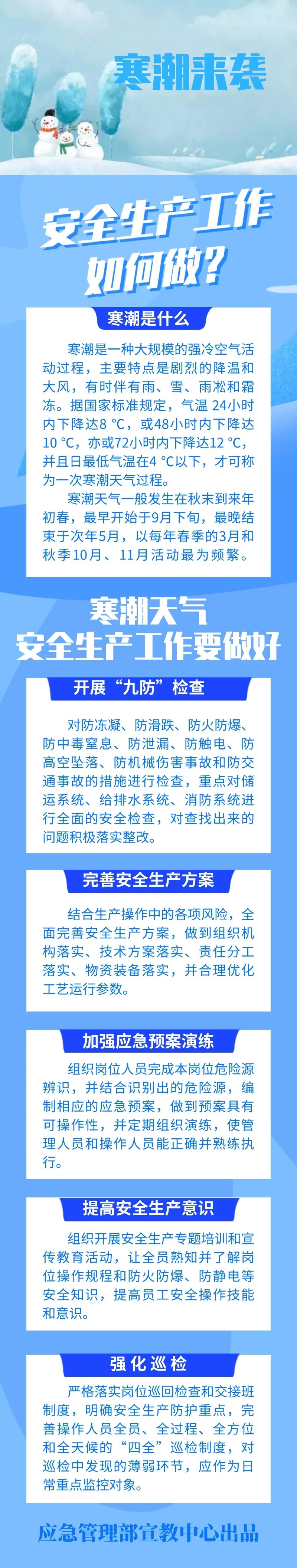 寒潮是一種大規模的強冷空氣活動過程,主要特點是劇烈的降溫和大風,有時伴有雨、雪和霜凍等,且因低溫雨雪冰凍災害鏈復雜,極易導致次生、衍生災害。寒潮來襲,如何確保生產安全?這份指南請收好。