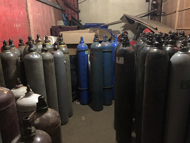 浙江杭州市案例:202138日上午,浙江省杭州市蕭山區(qū)應急管理局執(zhí)法人員對某公司進行執(zhí)法檢查。期間,執(zhí)法人員發(fā)現(xiàn)廠區(qū)內(nèi)一簡易鋼棚搭設的倉庫,玻璃窗均被物體人為遮擋,檢查發(fā)現(xiàn)倉庫內(nèi)堆放了大量危化品,包括滿瓶二氧化碳、氧氣、乙炔、混合氣體、氮氣等176個氣瓶。同時,該倉庫緊鄰公司員工宿舍樓搭設,宿舍樓里還住著數(shù)十個工人,一旦發(fā)生爆炸,后果不堪設想。