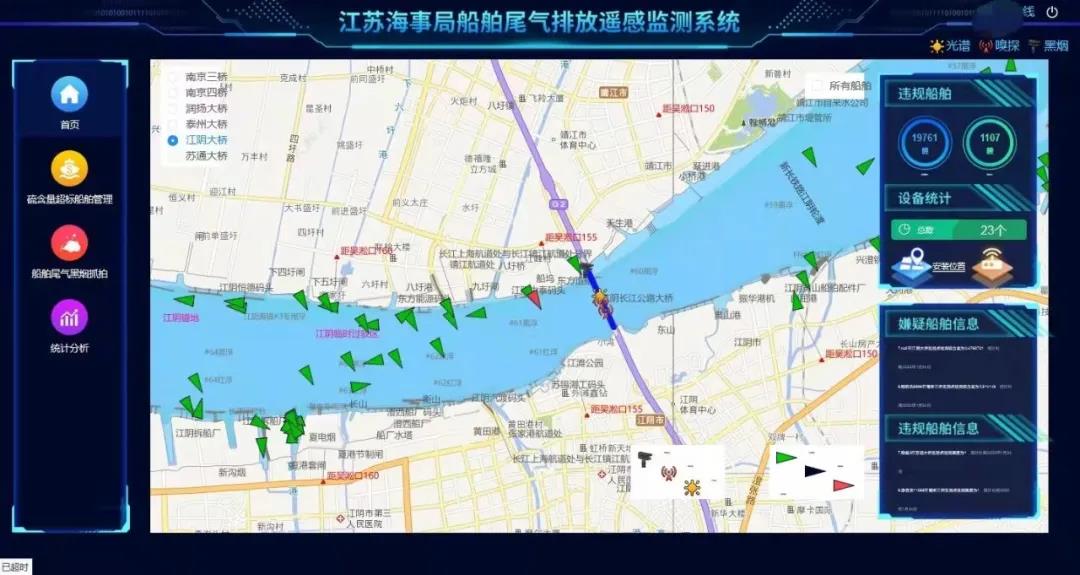 在長江江陰段轄區,依托江陰長江大橋架設了3套采用光譜、嗅探等不同工作原理的硫含量監測黑煙抓拍等專業設備,船舶尾氣排放遙感監測系統成為江陰海事局深化建設船舶污染防治“江蘇模式”江陰樣板區、精準防治船舶尾氣污染、助力打贏藍天保衛戰的科技利器。
