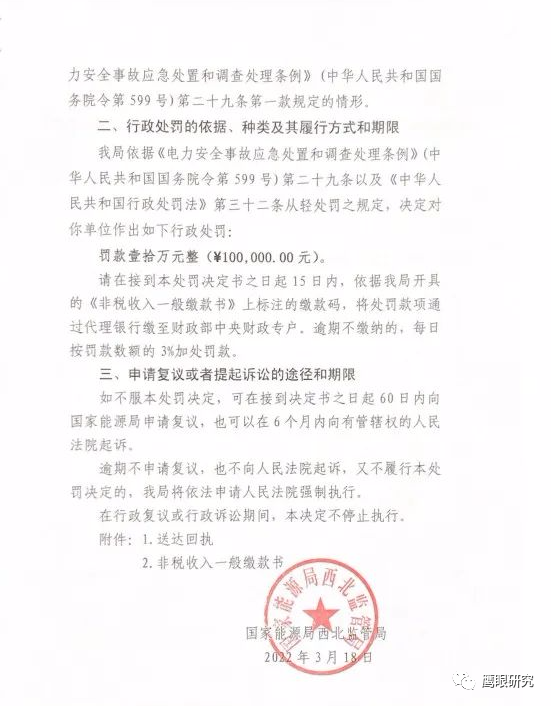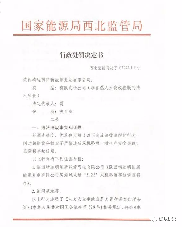 3月18日,國家能源局西北監管局發布對陜西靖邊明陽新能源發電有限公司的行政處罰決定書(西北監能罰決字〔2022〕5號),該公司因對缺陷設備檢查不嚴格造成風機墜落一般生產安全事故,且漏報事故信息,對其作出罰款10萬元的決定。