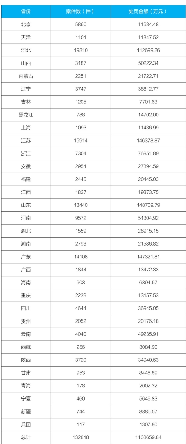 行政處罰案件數量排名前五的省份為:河北、江蘇、廣東、山東、河南。罰款金額排名前五的省份為:山東、廣東、江蘇、河北、浙江。