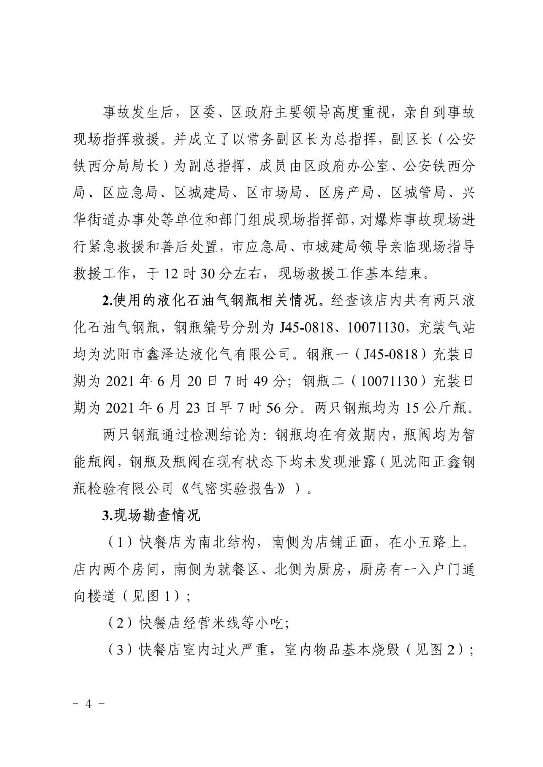 2021 年 6 月 24 日 4 時 11 分左右,位于沈陽市鐵西區(qū)小五路 54 號 3 門,沈陽市鐵西區(qū)小五路張小嘿快餐店內(nèi)發(fā)生液化石油氣泄漏爆炸,無人員傷亡,直接經(jīng)濟損失 70 余萬元。