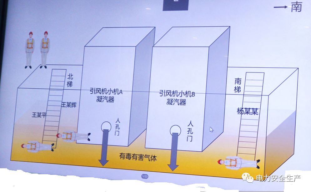 15:40安潔公司楊某某等4名作業(yè)人員,從#4機組汽動引風機室北側鋼步梯依次走下凝汽器區(qū)域準備清理垃圾及取回相關工具,走在前面的王某某、王某某在下樓梯半途中暈倒并滑落至樓梯底部,走在后面的楊某某、王某某發(fā)現(xiàn)情況異常,隨即退至汽動引風機室外,并電話報告檢修部鄭某某。