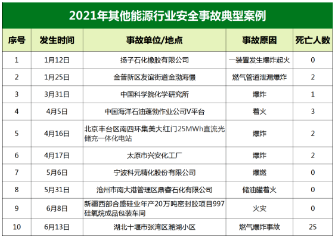 除電力、煤礦事故外,其他能源行業(yè)安全事故也時(shí)有發(fā)生。國際能源網(wǎng)記者總結(jié)了2021年典型能源安全事故發(fā)現(xiàn),其他能源行業(yè)安全事故多為火災(zāi)事故。天然氣、化工廠、儲(chǔ)能電站依然是火災(zāi)事故隱患較為集中的領(lǐng)域。因此,做好消防措施也是減少人員傷亡的有效手段之一。