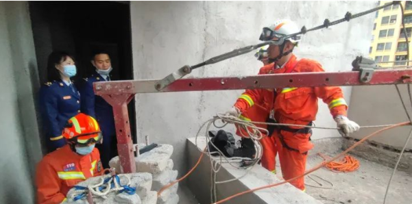 “師傅,千萬不要亂動,保持情緒穩定,我們馬上來救你們!”消防指揮員一邊通過喊話,安撫被困工人,一邊令人攜帶救生繩索和防墜落部件等救生器材,進入建筑物內展開救援。