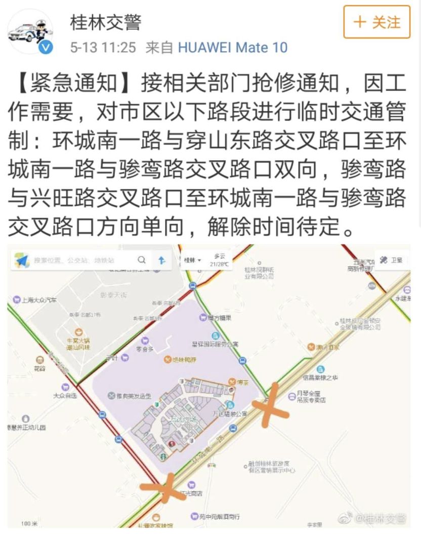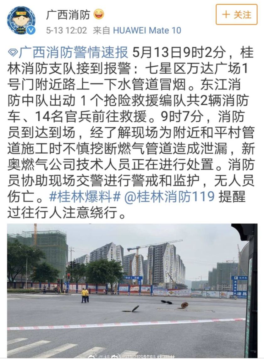 中午12時,@廣西消防官微發布了一警情速報:5月13日9時2分,桂林消防支隊接到報警:七星區萬達廣場1號門附近路上一下水管道冒煙。9時7分,消防員到達到場,經了解現場為附近和平村管道施工時不慎挖斷燃氣管道造成泄漏,新奧燃氣公司技術人員正在進行處置。消防員協助現場交警進行警戒和監護,無人員傷亡。