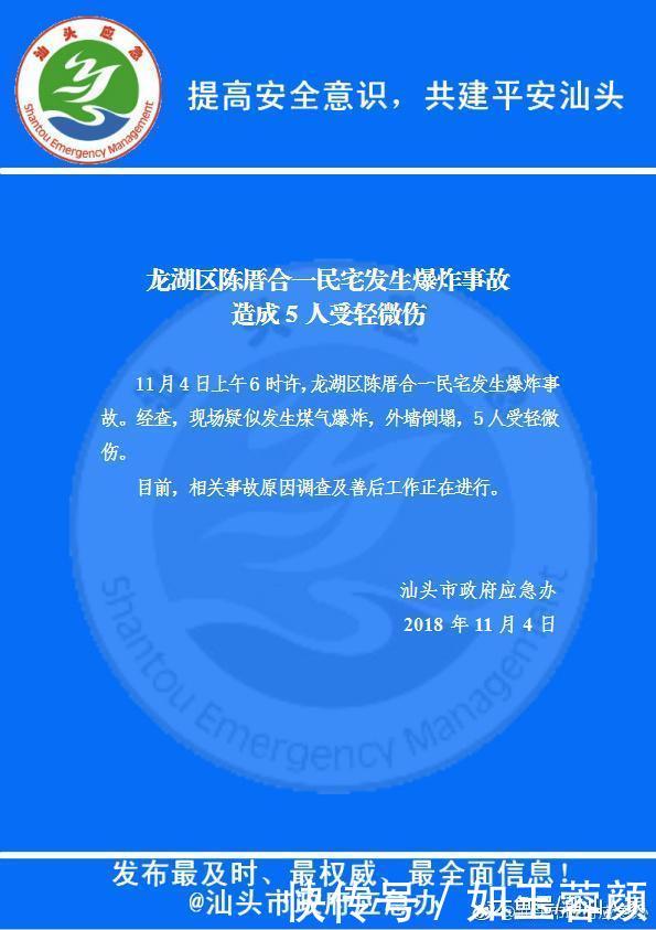 據(jù)“汕頭市政府應急辦”發(fā)布通報稱:2018年11月4日上午6時許,汕頭龍湖區(qū)陳厝合一民宅發(fā)生爆炸事故。經(jīng)查,現(xiàn)場疑似發(fā)生煤氣爆炸,外墻倒塌,5人受輕微傷。目前,相關(guān)事故原因調(diào)查及善后工作正在進行。