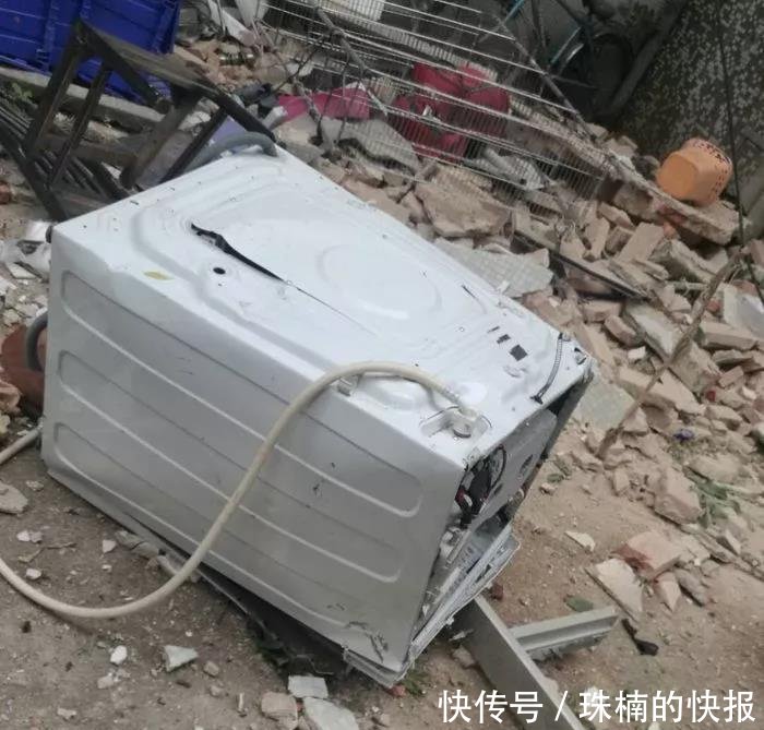 事發地點位于桃園小區34棟3梯2樓。記者在現場看到,2樓住宅西面及南面的墻壁被震塌,倒下的墻體砸中樓下一部小車。二樓門框和洗衣機等家具也掉到樓下,磚塊瓦礫、玻璃碎片灑落一地,現場一片狼藉,可見當時爆炸的威力十分巨大。