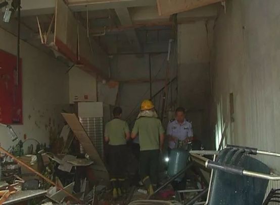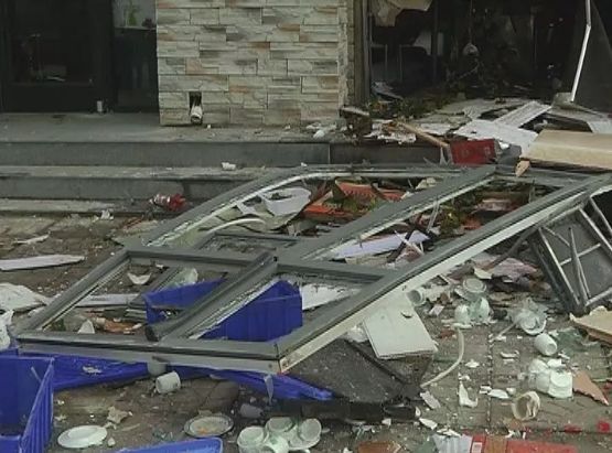 事故現場一片狼藉,飯店屋內的東西散落在人行便道上,馬路上也散落著許多的玻璃碎屑...