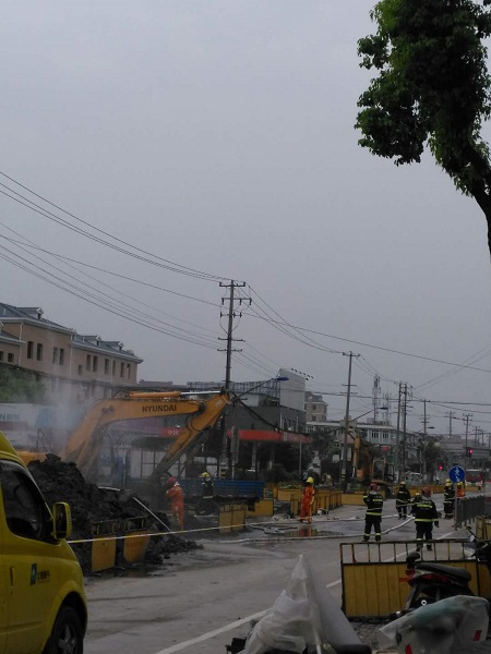 據(jù)附近市民介紹,近期,國權(quán)北路正在進(jìn)行道路施工。昨天下午,一臺(tái)挖掘機(jī)在作業(yè)時(shí),不慎將地下一根燃?xì)夤艿劳跀啵D時(shí),大量氣體從管道內(nèi)噴出,空氣中還彌漫著一股濃烈的煤氣味。目擊者稱,管道被挖破后,現(xiàn)場(chǎng)噴出白色氣體,并不斷發(fā)出“嗤嗤”的聲音,工人們見狀,趕緊將挖掘機(jī)熄火。