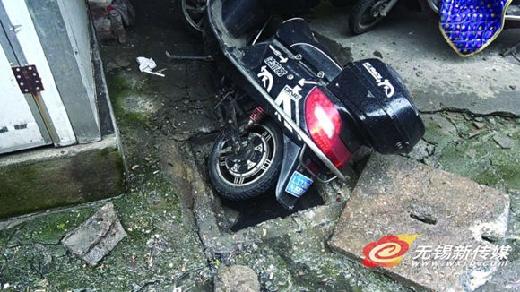 現場了解到,這次自行“跳躍”的窨井蓋數目不少,不過事故的動靜不大,只有窨井蓋周圍有崩壞的痕跡,掉落下一些水泥塊,周圍并無燃燒跡象,也沒造成人員受傷。要說最“嚴重”的,則是其中一個窨井旁停放的電動車,被彈起的窨井蓋撞倒(見圖)。