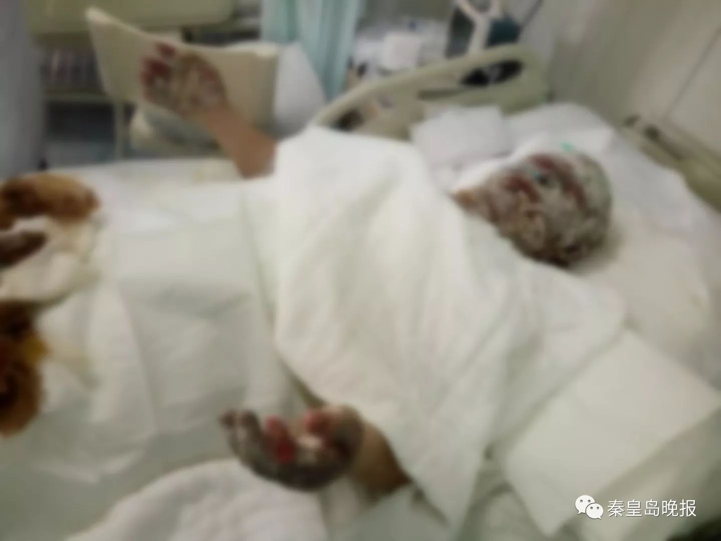 在這間潔凈、有著精密治療儀器的病房里,李偉鵬父母的病床是相鄰的4床和5床,中間只隔著1條1米多寬的通道。愛漂亮的母親沒了滿頭秀發(fā),臉上布滿燒傷痕跡,裸露在外的皮膚都纏裹著厚厚的紗布。曾經(jīng)意氣風(fēng)發(fā)的父親五官腫脹變形,眼睛腫成一道縫。