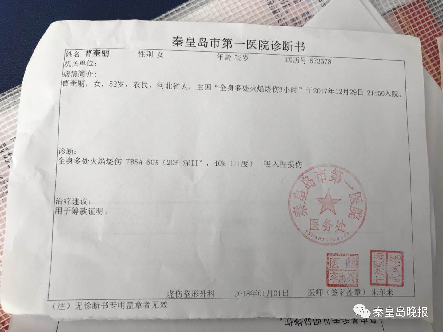 2017年12月29日,李偉鵬最不愿意回憶的一天——父母在青龍滿族自治縣龍王廟鄉(xiāng)經(jīng)營的小餐館煤氣罐泄漏爆炸引發(fā)火災(zāi),在火海中掙扎的父母被鄰居救出送往醫(yī)院,全身大面積燒傷,傷情更為嚴(yán)重的母親燒傷面積達(dá)60%。