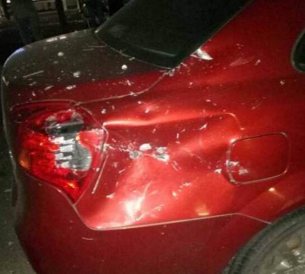 記者從現場視頻中可見,一家名為 " 誠信藥店 " 的店面玻璃門破損變形,里面的柜臺和房頂被炸得七零八落,地面一片狼藉。路上和門外兩輛轎車上散落著碎玻璃,車身因為撞擊發生凹凸變形,可見當時的沖擊力很大。
